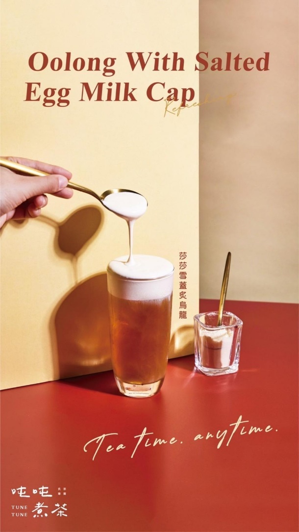 「莎莎雪蓋炙烏龍」以奶蛋黃風味的奶蓋搭配炙烏龍的焙火茶香,帶來獨特的鹹甜交織口感。(圖/吨吨煮茶提供)